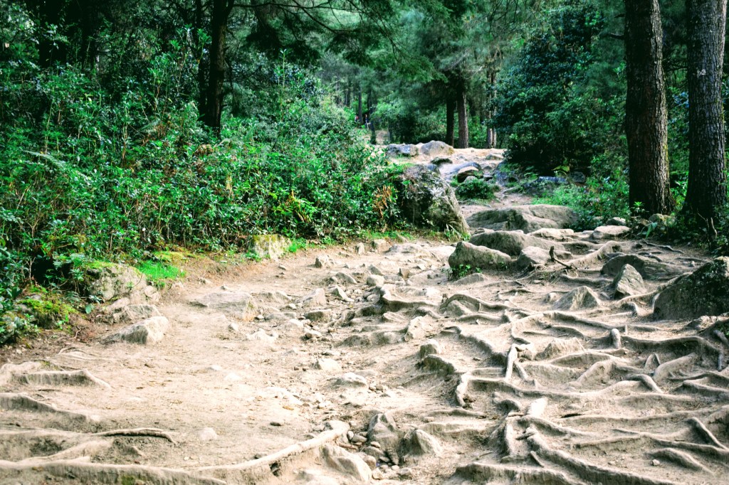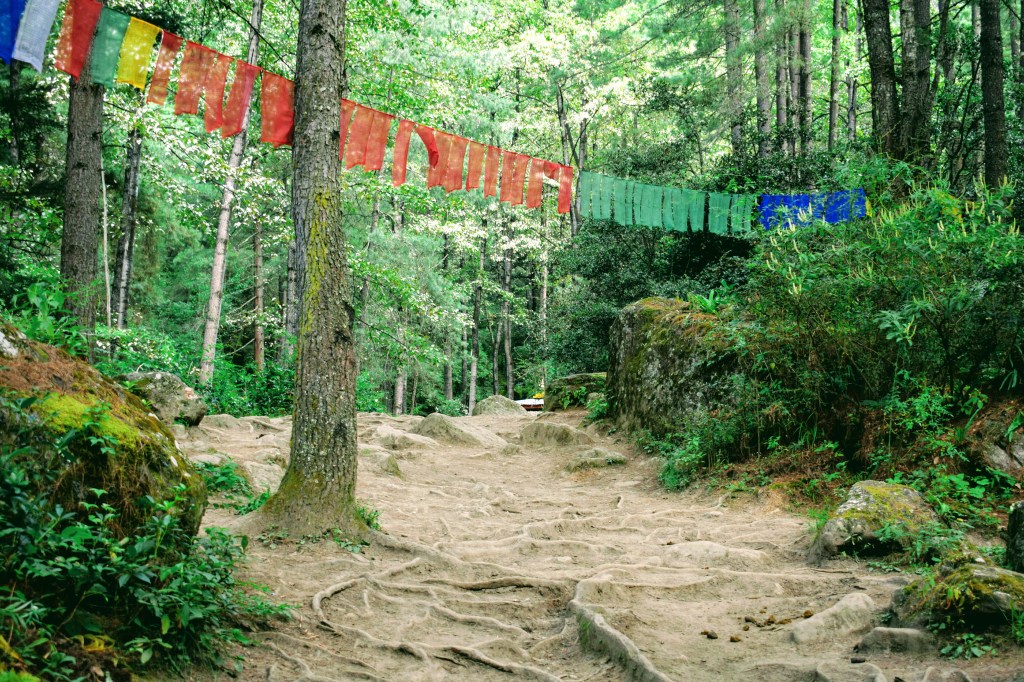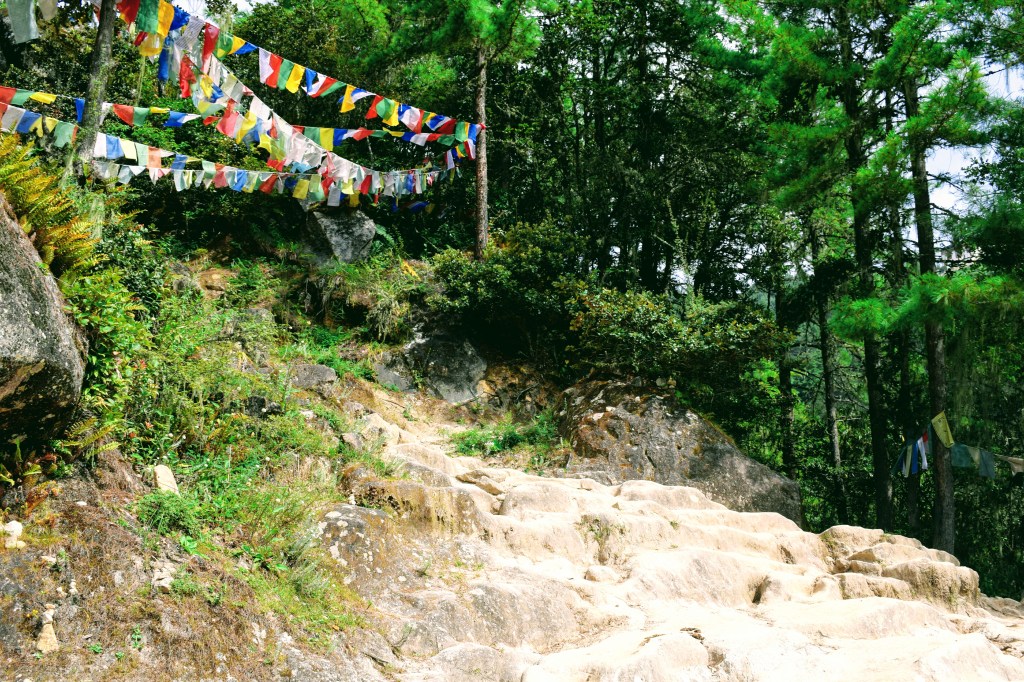 The climb up is a gradual incline. The trail is dirt and mud surrounded by pine trees. Prayer flags are found fluttering happily throughout the trail.