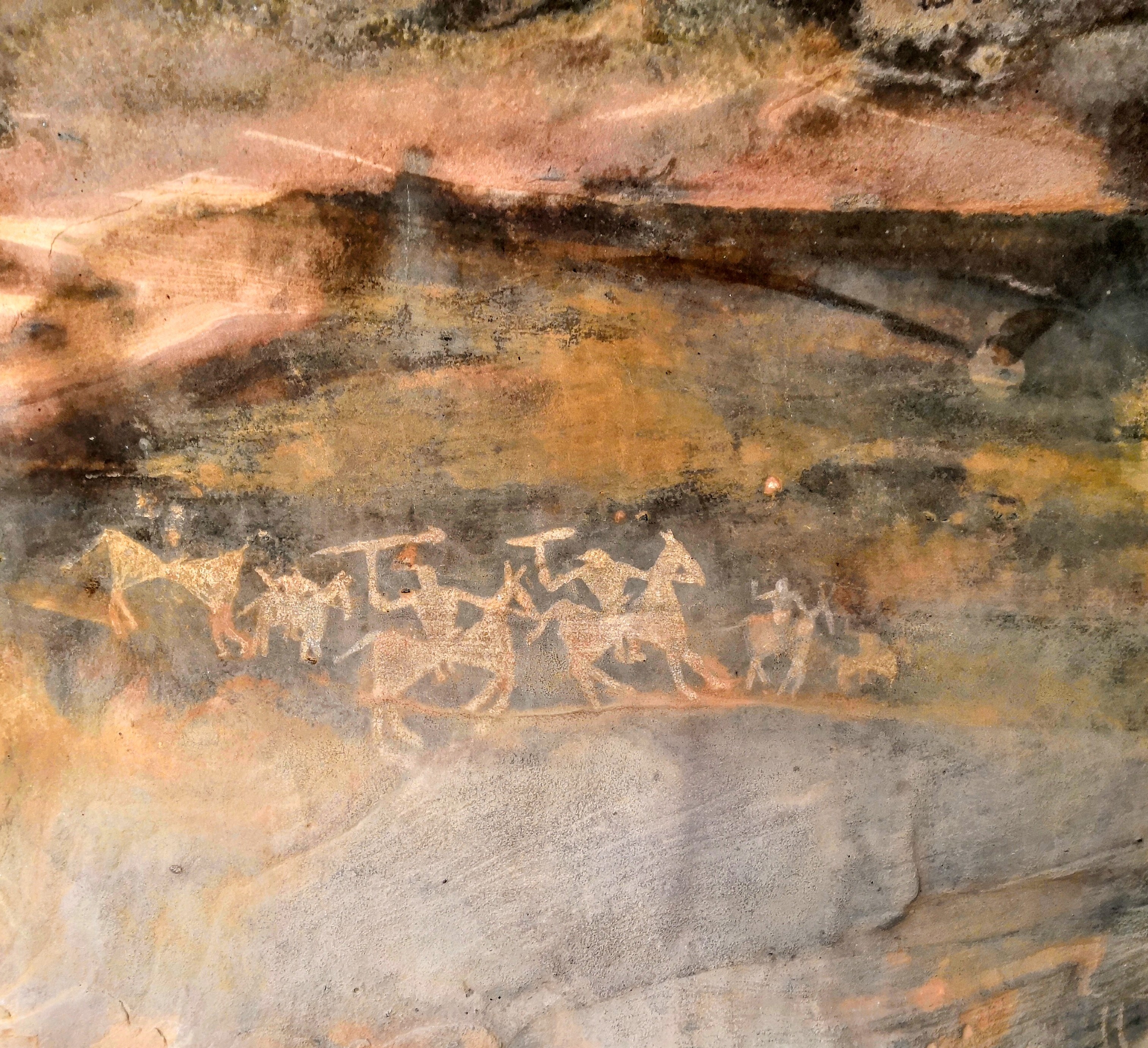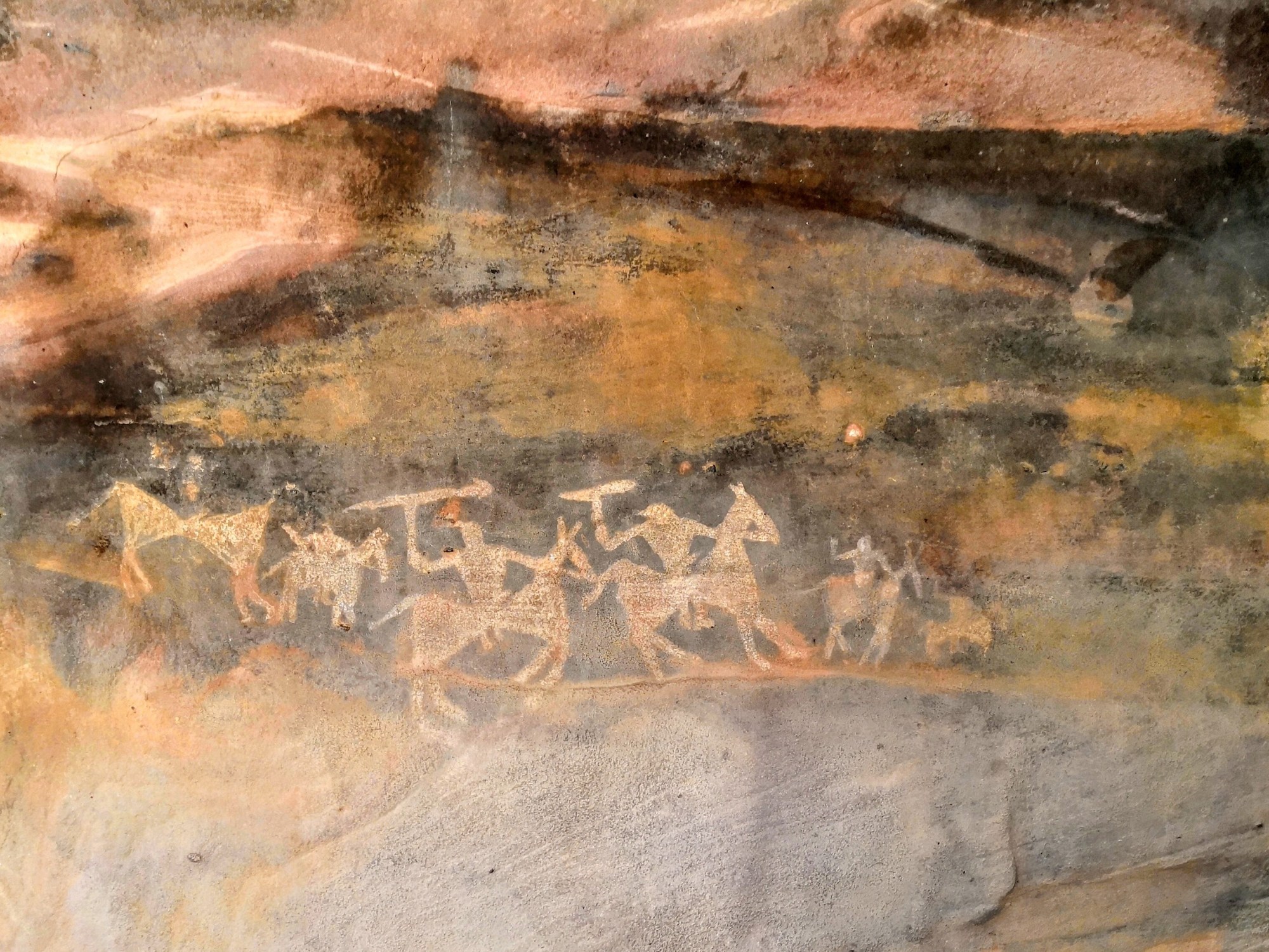 The historic paintings have images of people riding horses, carrying weapons and fighting – the agrarian period where humans had settled in one place. Man attacking an elephant and a clan going to war can be seen below.