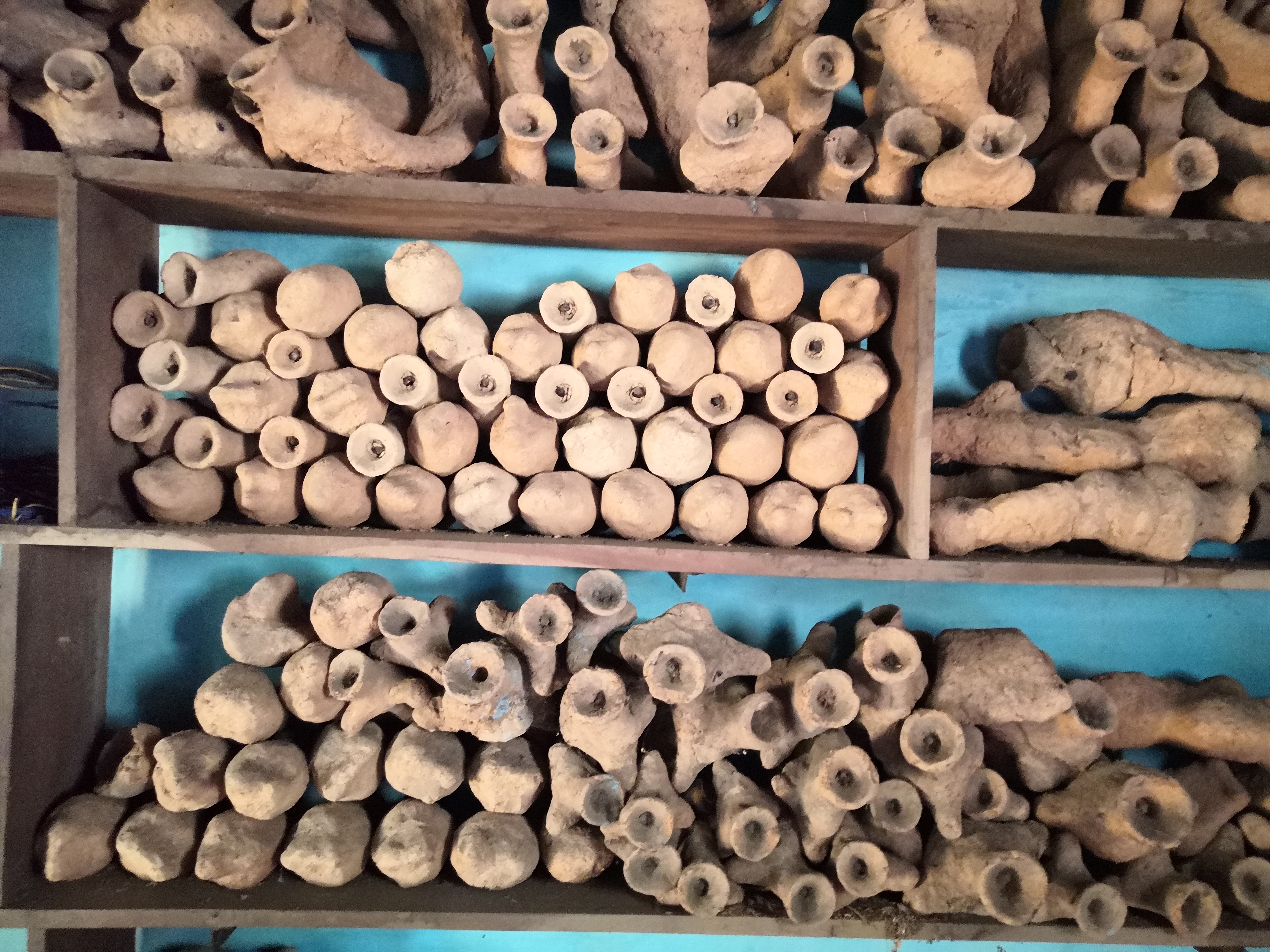 Clay is again poured over the wax mould. Ducts are made in order to drain the wax when this mould is heated. The wax drains away and what remains is the hollow clay mould which has taken the shape from the wax on the inside of the mould.