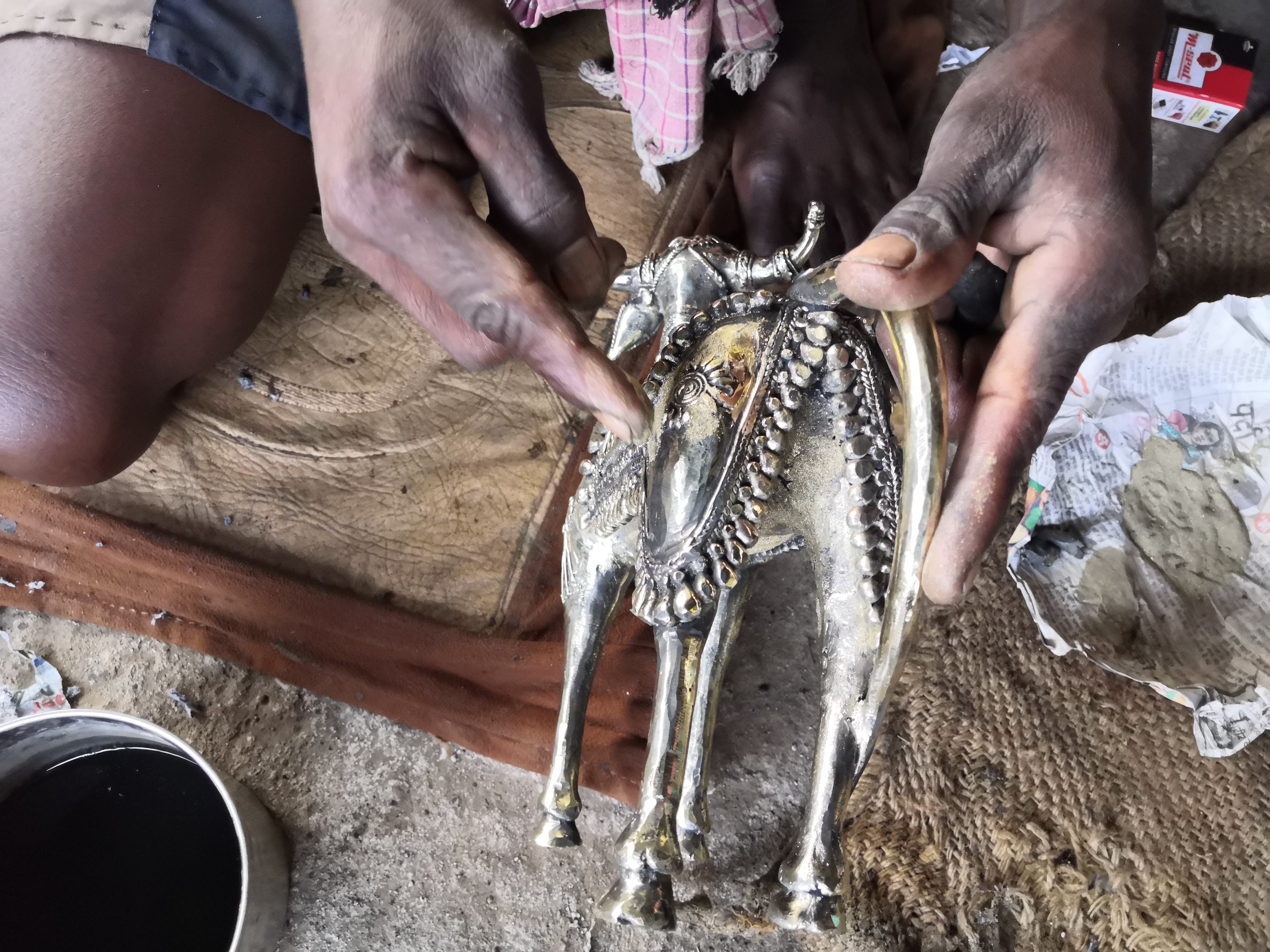 All buffed and polished the statue is given finishing touches. A cloth is used to remove traces of mud and dirt. There is an ‘aha moment’ as the completed figurine is placed in front of me. It glistens like gold, a perfect creation from the hands of man.