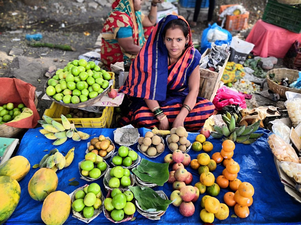 A lady sells chickoos, bananas and rose apples which are locally grown