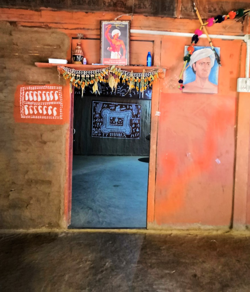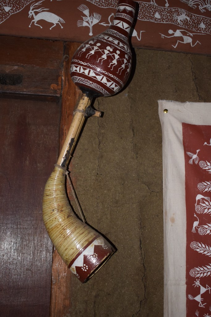 His home doubles up as an art studio, where his works are on display. Sanjay started by giving us a tour of his property. An immaculate house, with red ochre paint on the walls and cow dung paste on the floor greeted us. The roof has clay tiles and bamboo columns to support the house. His is a traditional Warli home, where local and natural materials have been used.