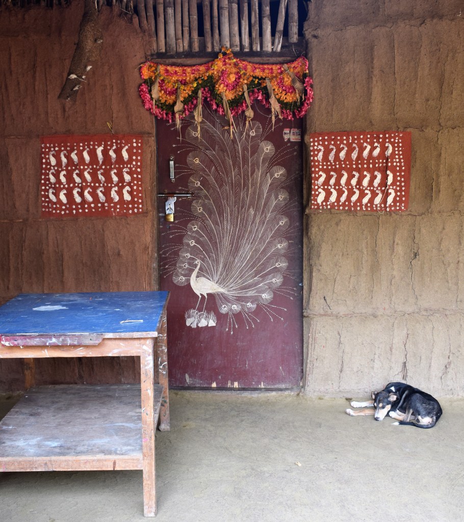 The background of the painting is typically painted in red ochre. The colour is derived from ‘geru’ a locally available mud that is naturally brownish red in colour. Cow dung is also used as a backdrop.