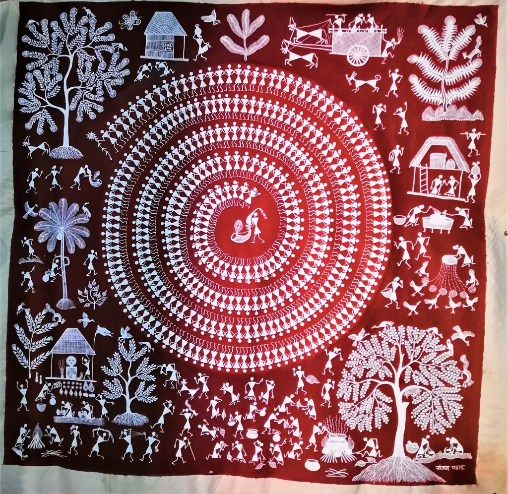 Scenes from daily life – People working in the fields, women with children, hunting scenes, and wedding images are painted. The symbols used are geometric shapes – triangles for the bodies, circles for the head and sticks for the hands and legs. The inspiration is from the sun, moon, mountains and trees. Paintings that have the square or ‘chauk’ in the center symbolize fertility.
