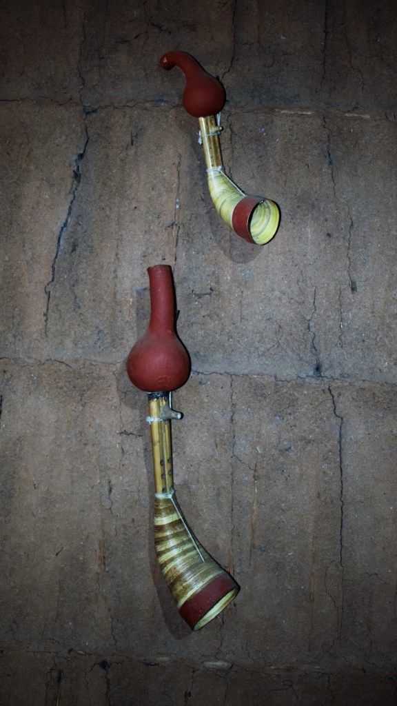 Most of the art depicts a circular formation imitating the circle of life. A ‘tarpa’ is mostly found at the centre of the circle. It is a musical instrument made from bamboo. The tarpa is used during festivals and celebrations and is similar to a trumpet.