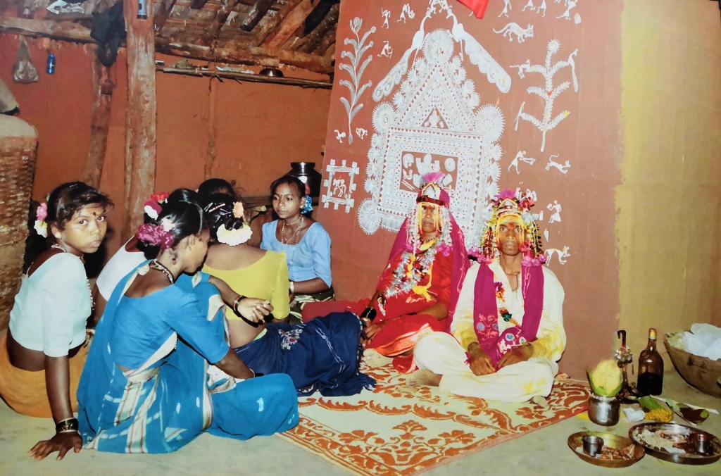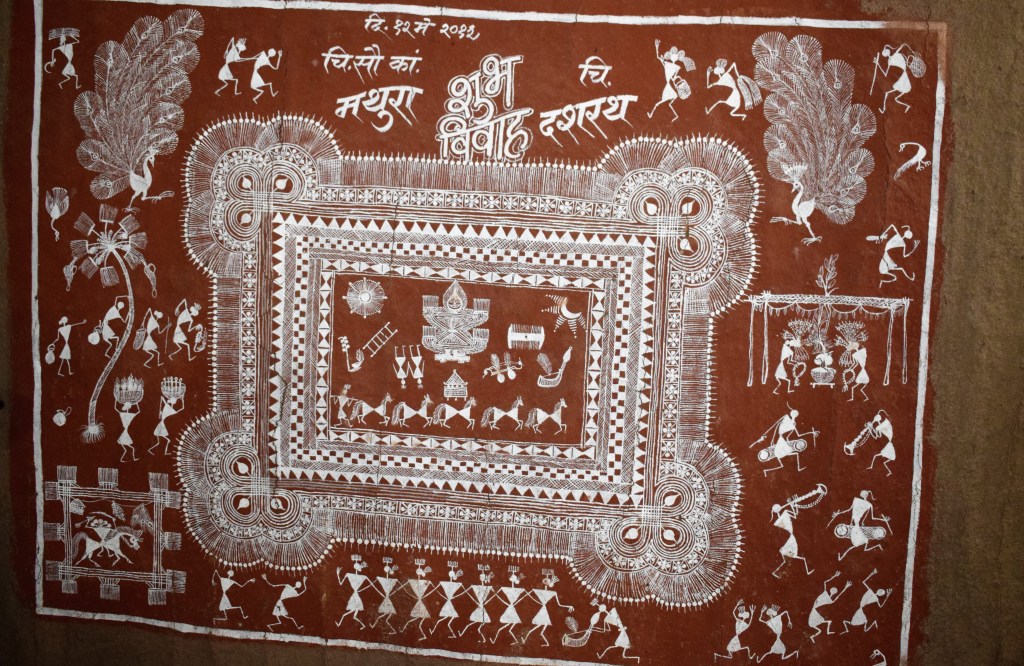 When a wedding is fixed, married women paint an entire wall of the house with the details of the bride, groom, date and traditional wedding scenes. They like to call it the wedding invitation card, an innovative wedding invite. The nuptials are a mix of traditional tribal practices and Hindu ceremonies.