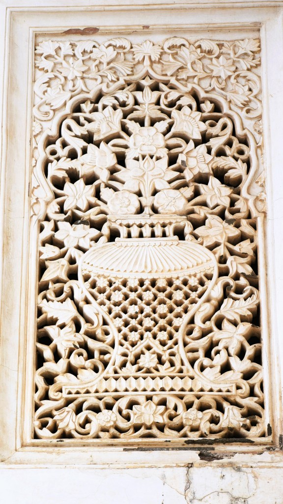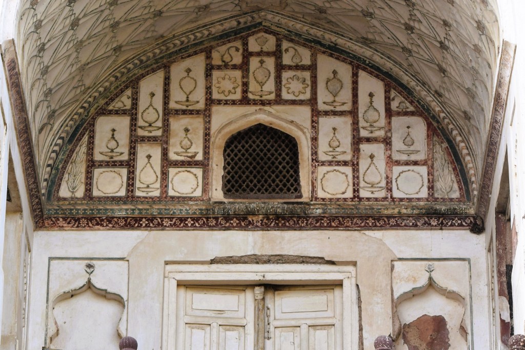 Rabia-ul-Durrani is buried below ground level, surrounded by an octagonal shaped marble screen. The first level entrance allows visitors to view the tomb below and the dome above.