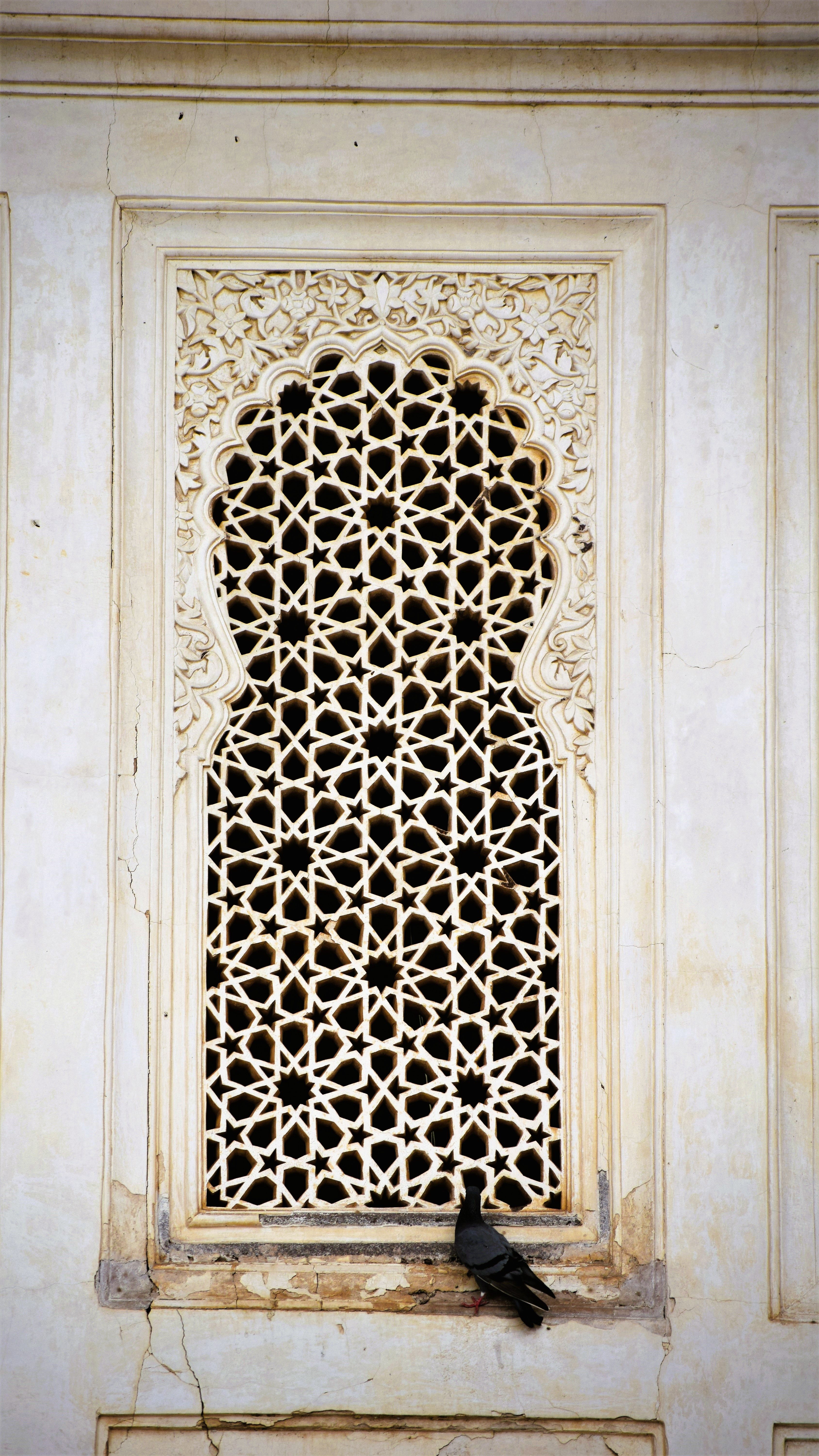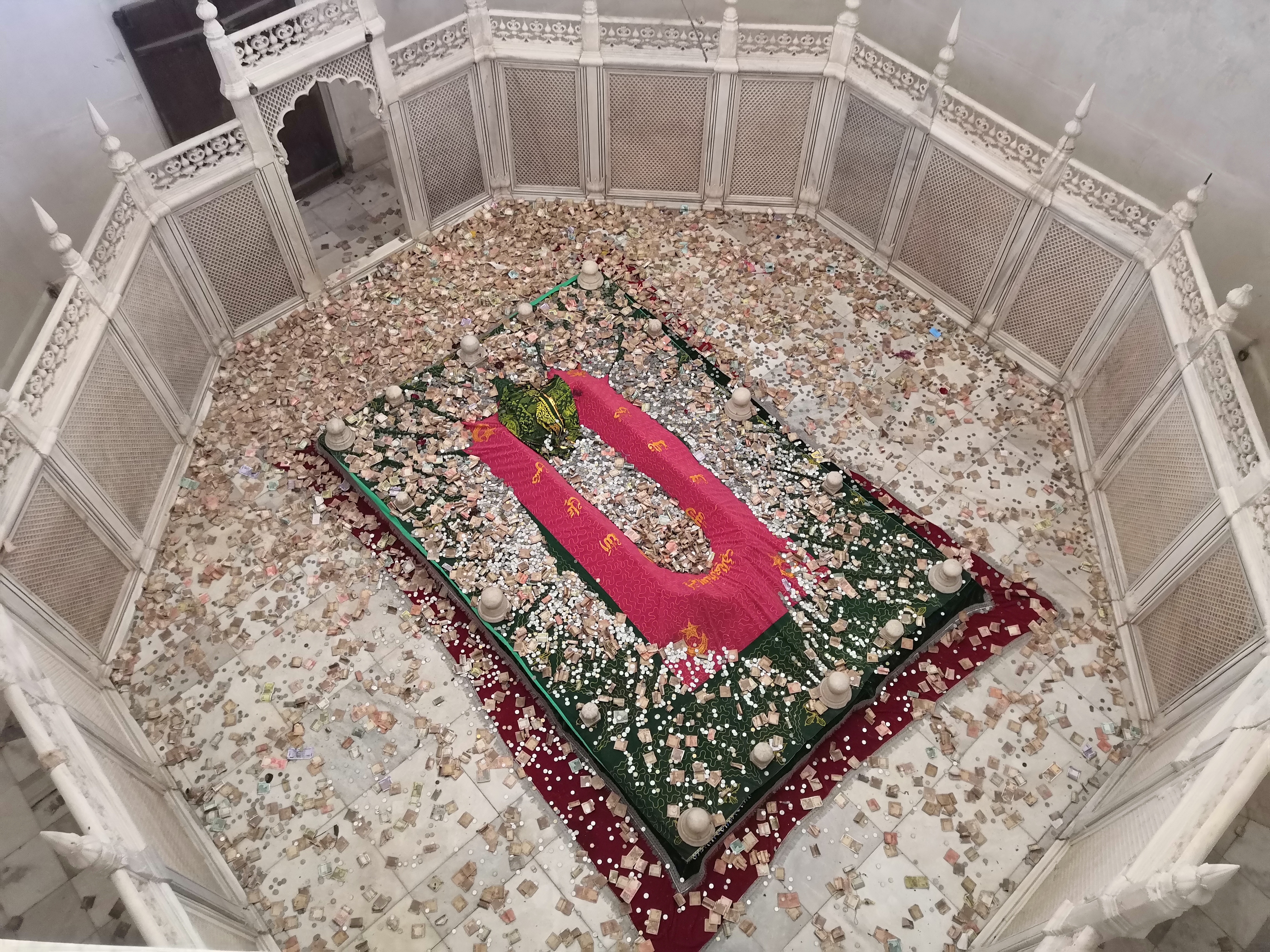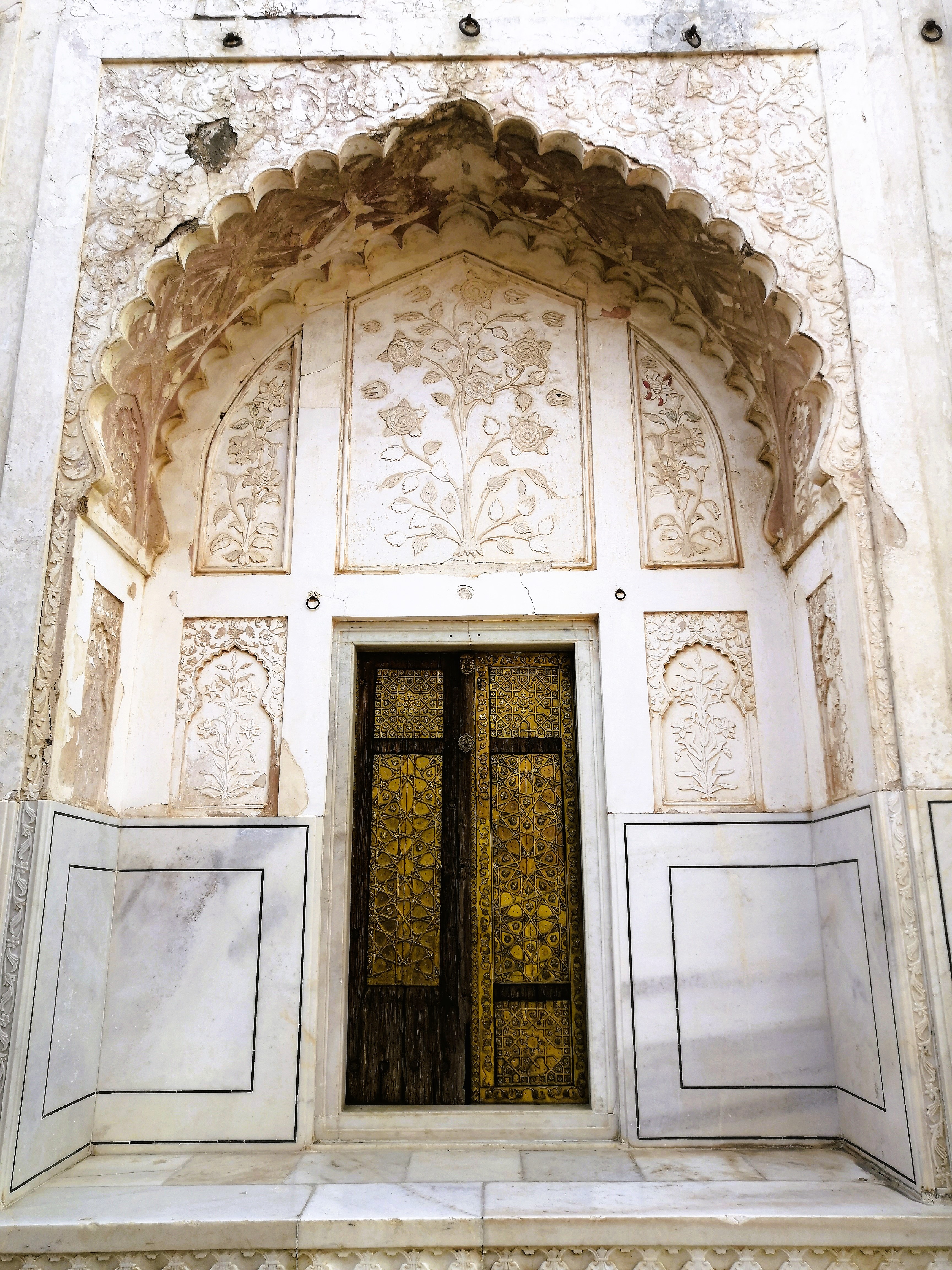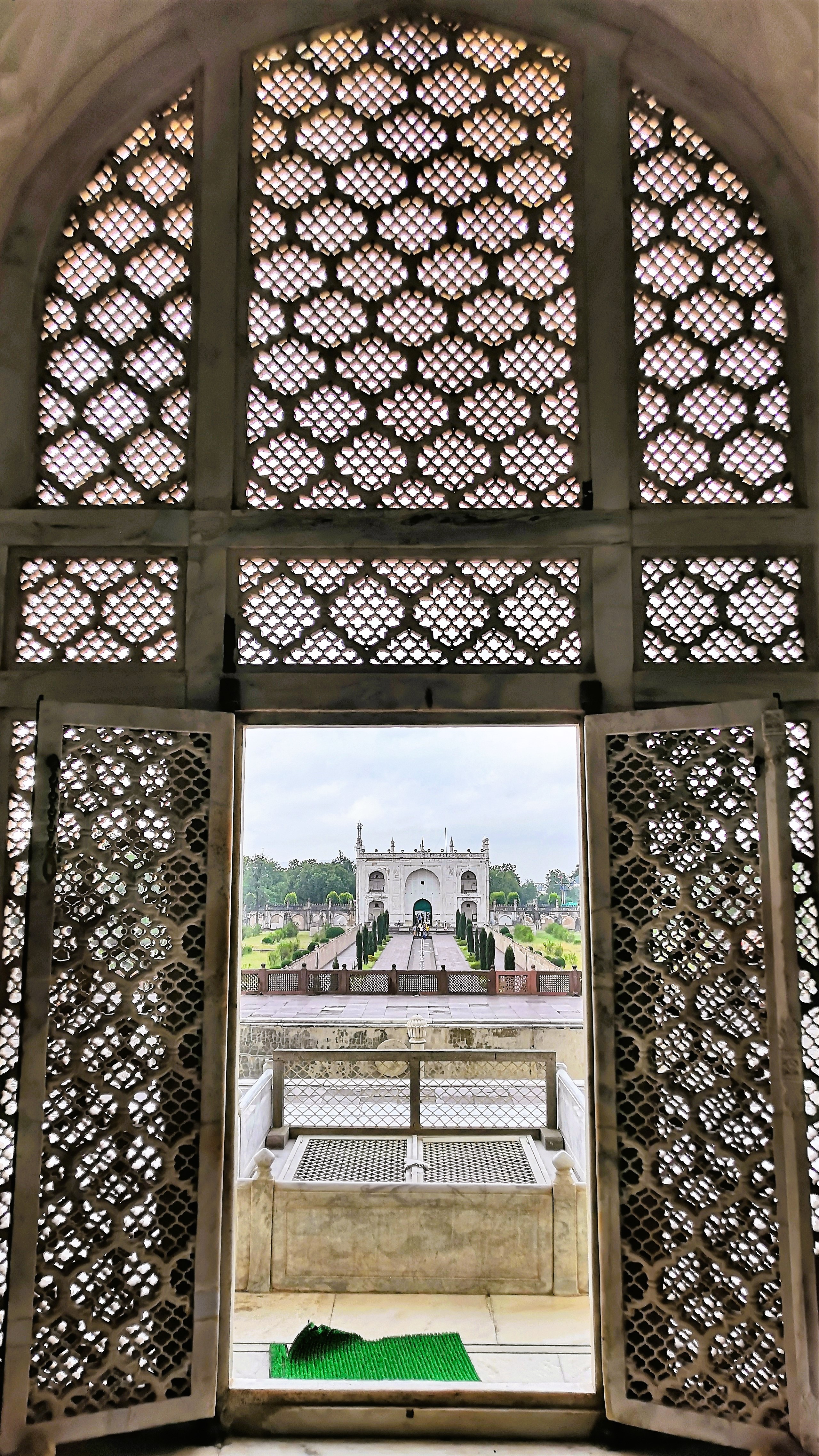 Rabia-ul-Durrani is buried below ground level, surrounded by an octagonal shaped marble screen. The first level entrance allows visitors to view the tomb below and the dome above.
