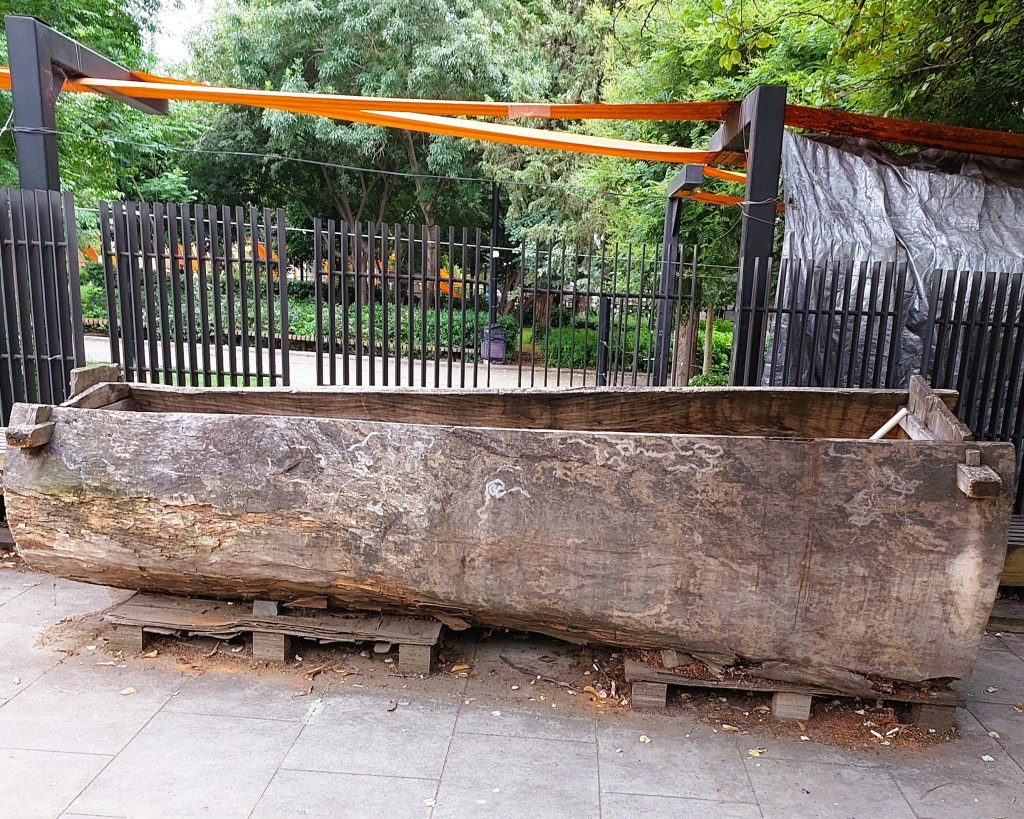 Someone stands inside a satsnakhekli – a long wooden structure like a boat to crush the grapes with their feet.