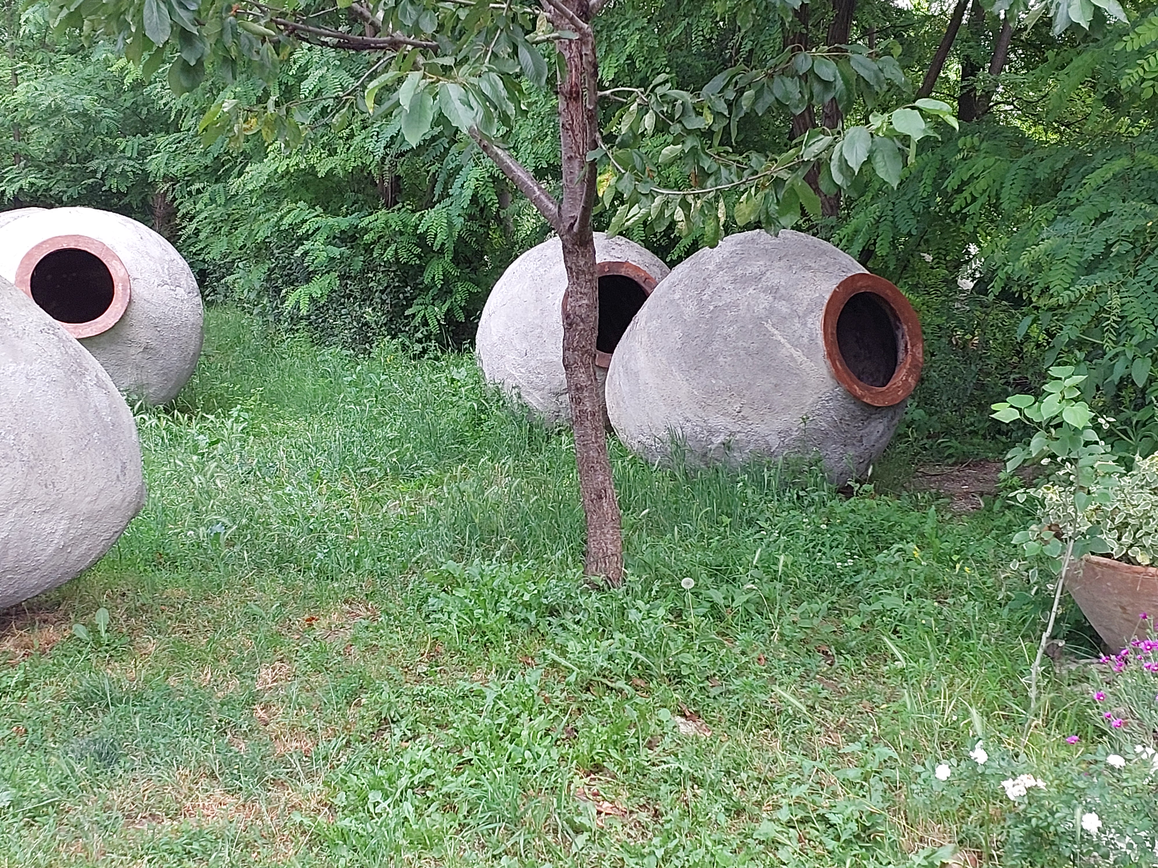 They are buried into the earth, up to the neck, in the wine cellar. Every year during wine season, someone goes inside them, cleans them by hand before pouring the grape juice for the fermentation.