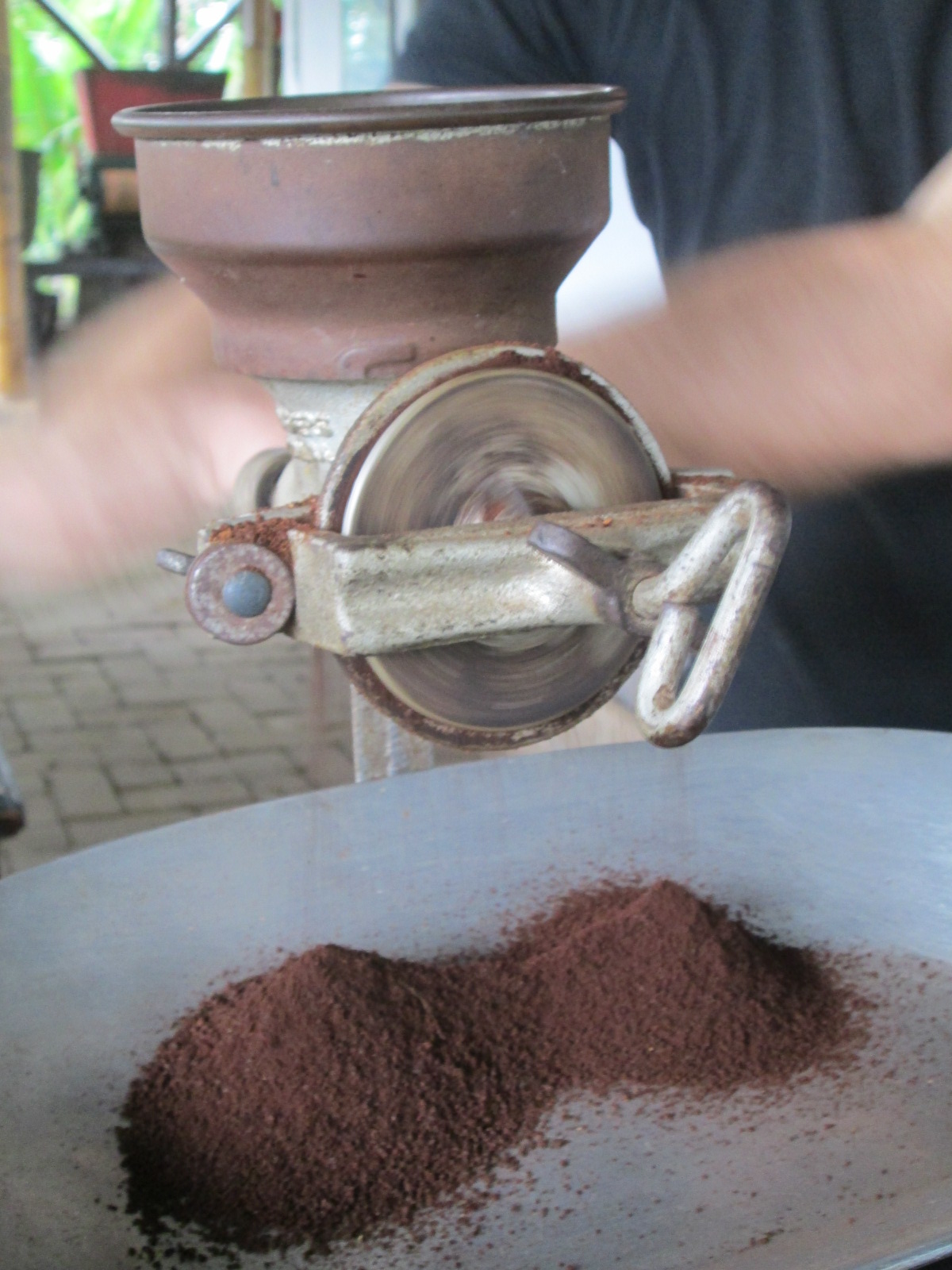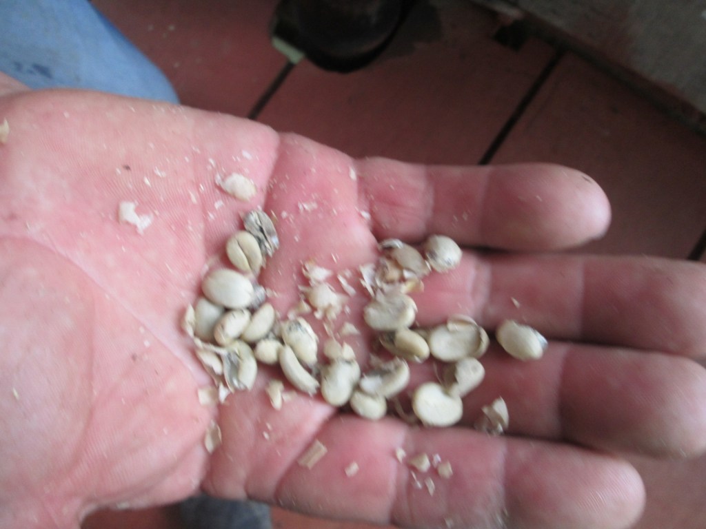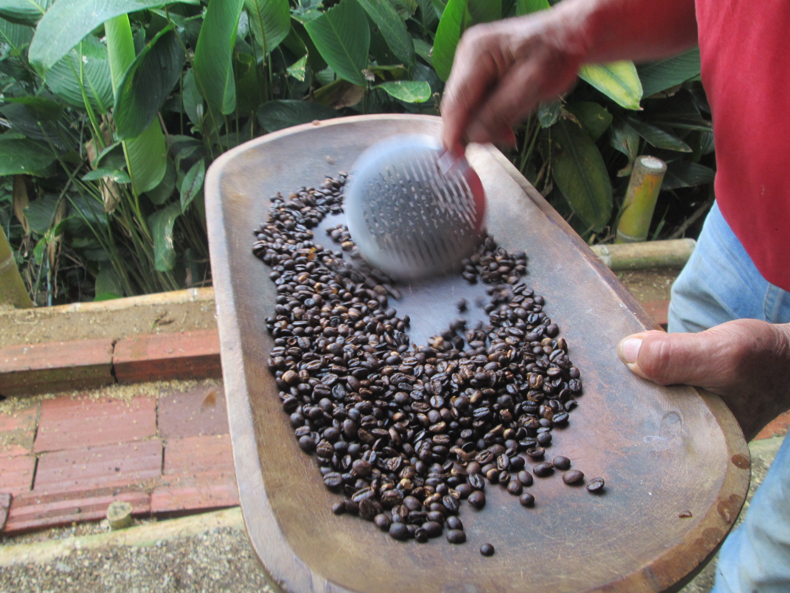 The dried beans were ready to be hulled — a process that removes the parchment layer or outer skin. This was done using a sieve, turned by hand. Simple, but effective.