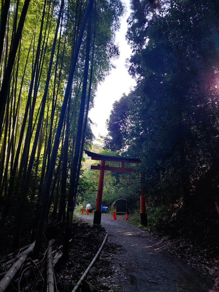 At the end of one quiet lane stood a vivid red torii gate — smaller, almost modest — marking the entrance to a bamboo-covered trail.