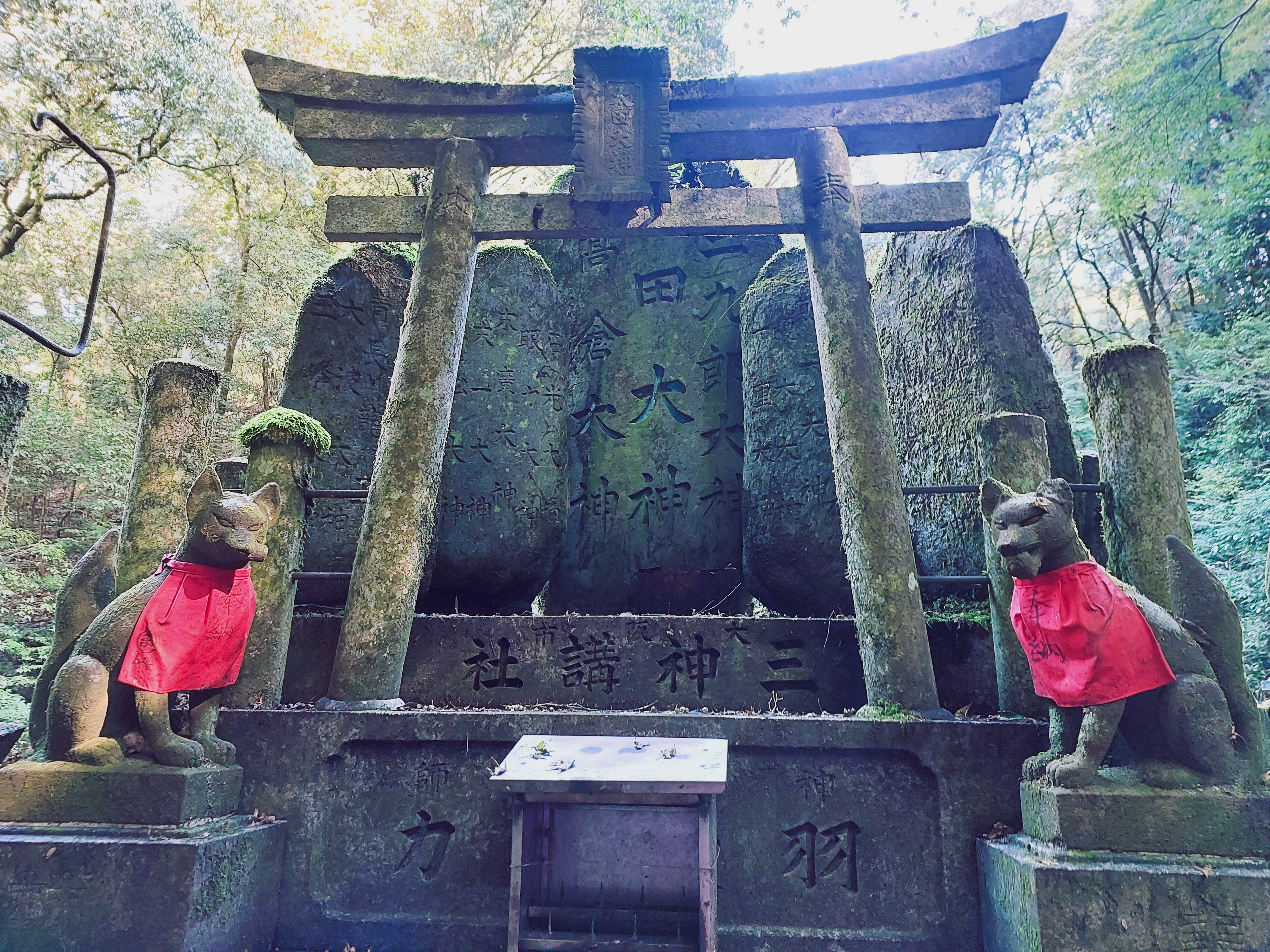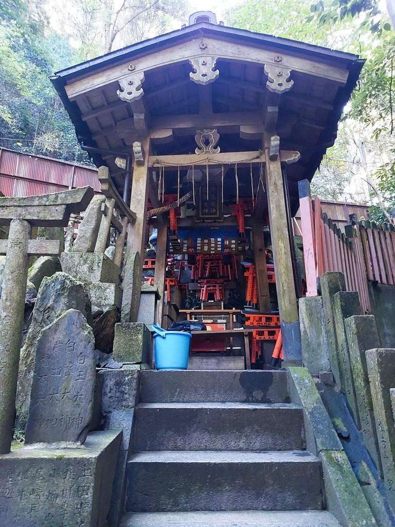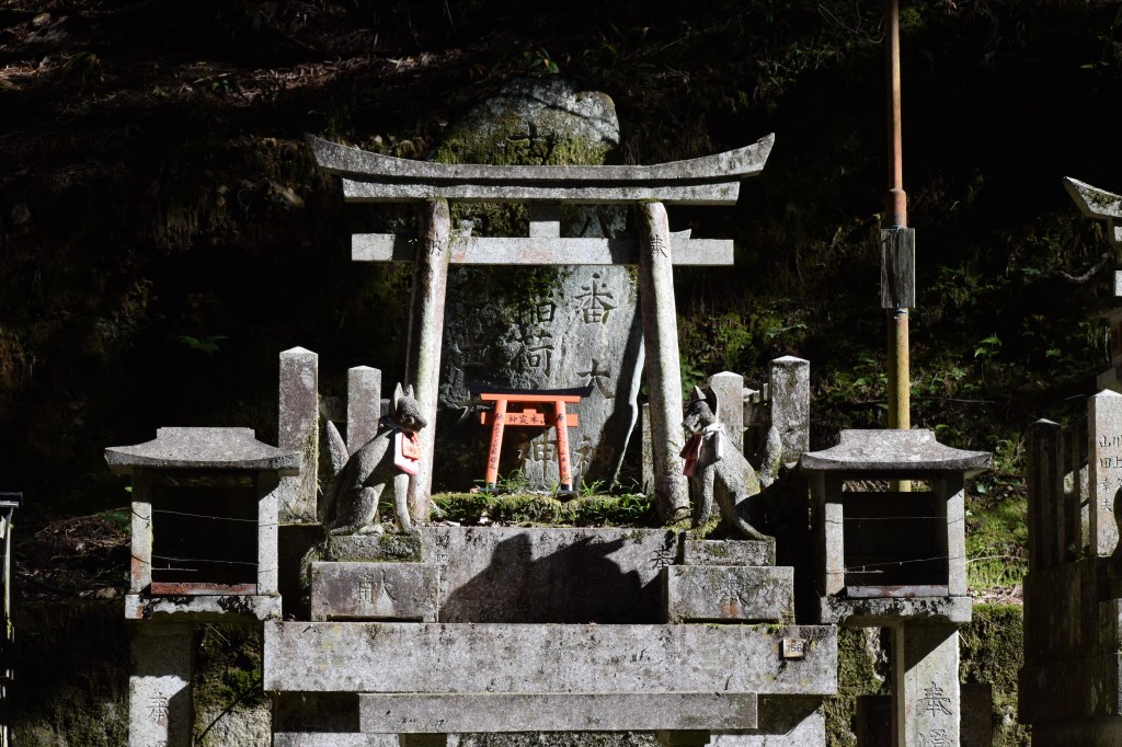Further along, we arrived at a fox shrine. Stone foxes — messengers of Inari — stood watch with quiet intensity. Some held symbolic objects in their mouths: keys, rice sheaves, scrolls. Offerings had been carefully placed before them. The atmosphere felt sacred and slightly mysterious, like a secret guarded for centuries.