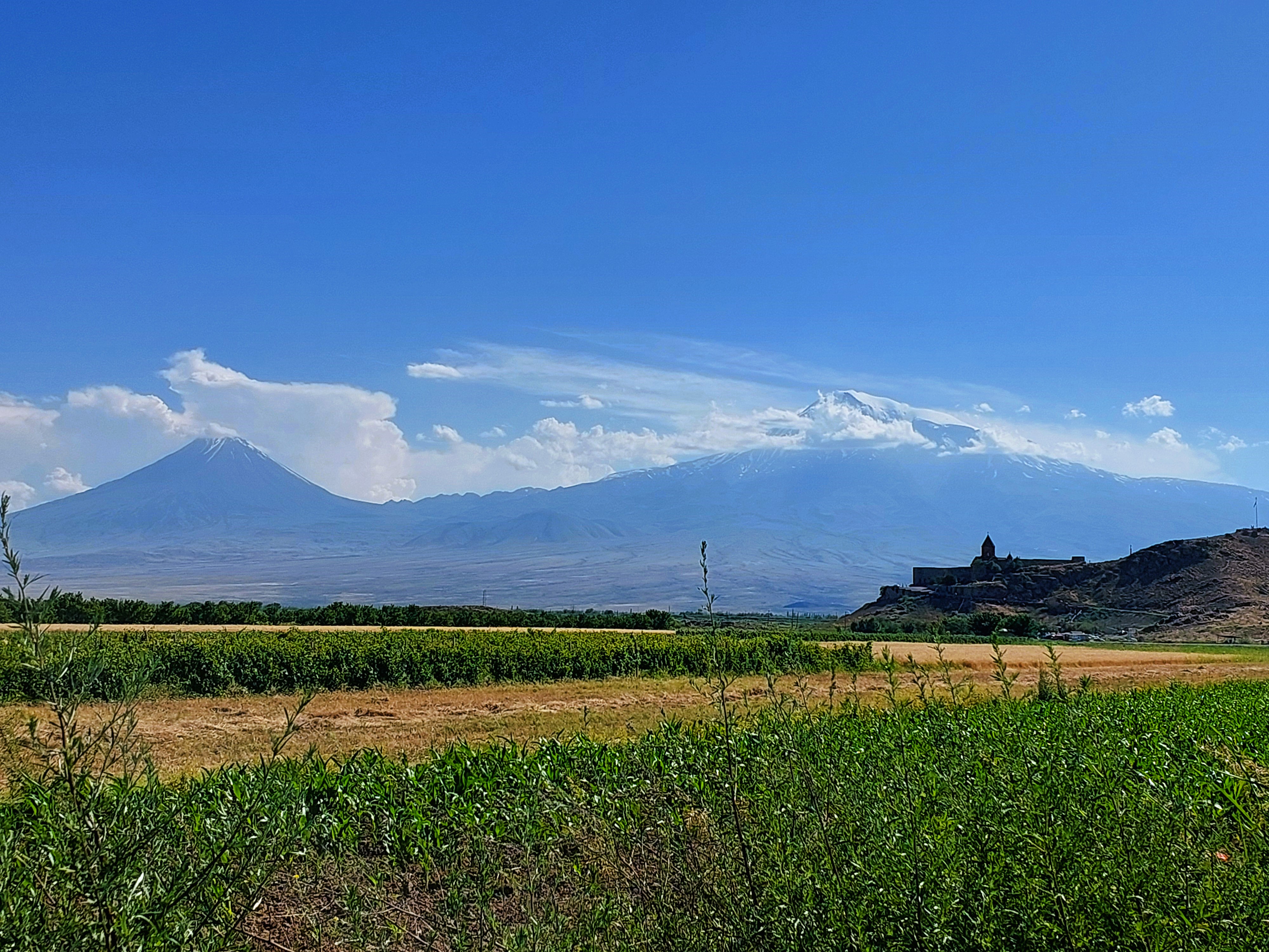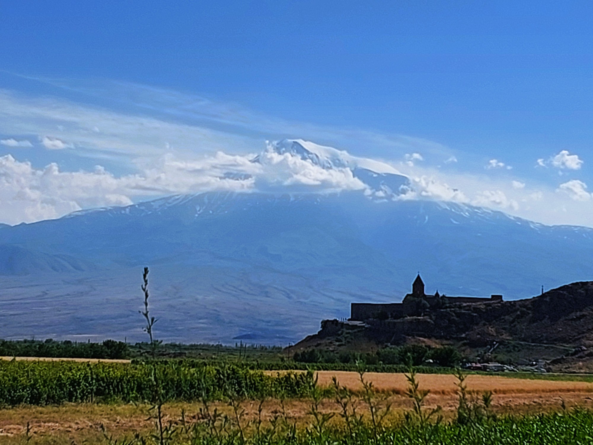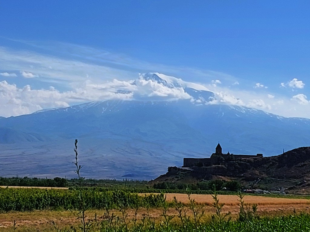 One of the most dramatic views of Ararat is from the Khor Virap Monastery near the Armenia – Turkey border. Here the plains open wide, and the mountain rises suddenly in the distance, its twin peaks sharp against the vast sky.